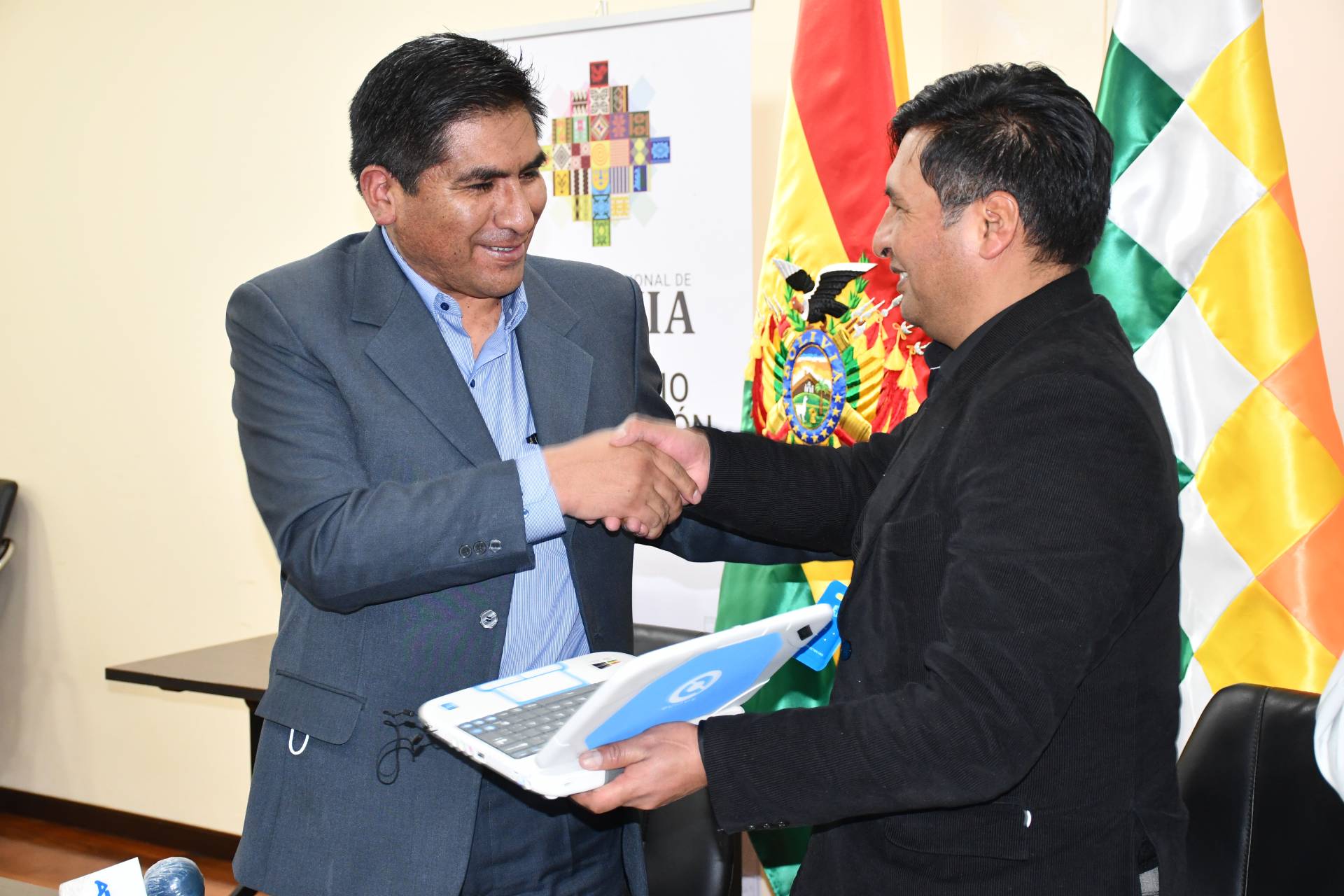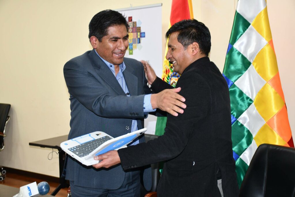 El ministro de Desarrollo Productivo y Economía Plural, Néstor Huanca, entregó este miércoles al titular de Educación, Adrián Quelca, un primer lote de computadoras Kuaa, en cumplimiento del decreto supremo que autoriza la transferencia de equipos de computación al Ministerio de Educación para su distribución a municipios identificados en situación de vulnerabilidad.