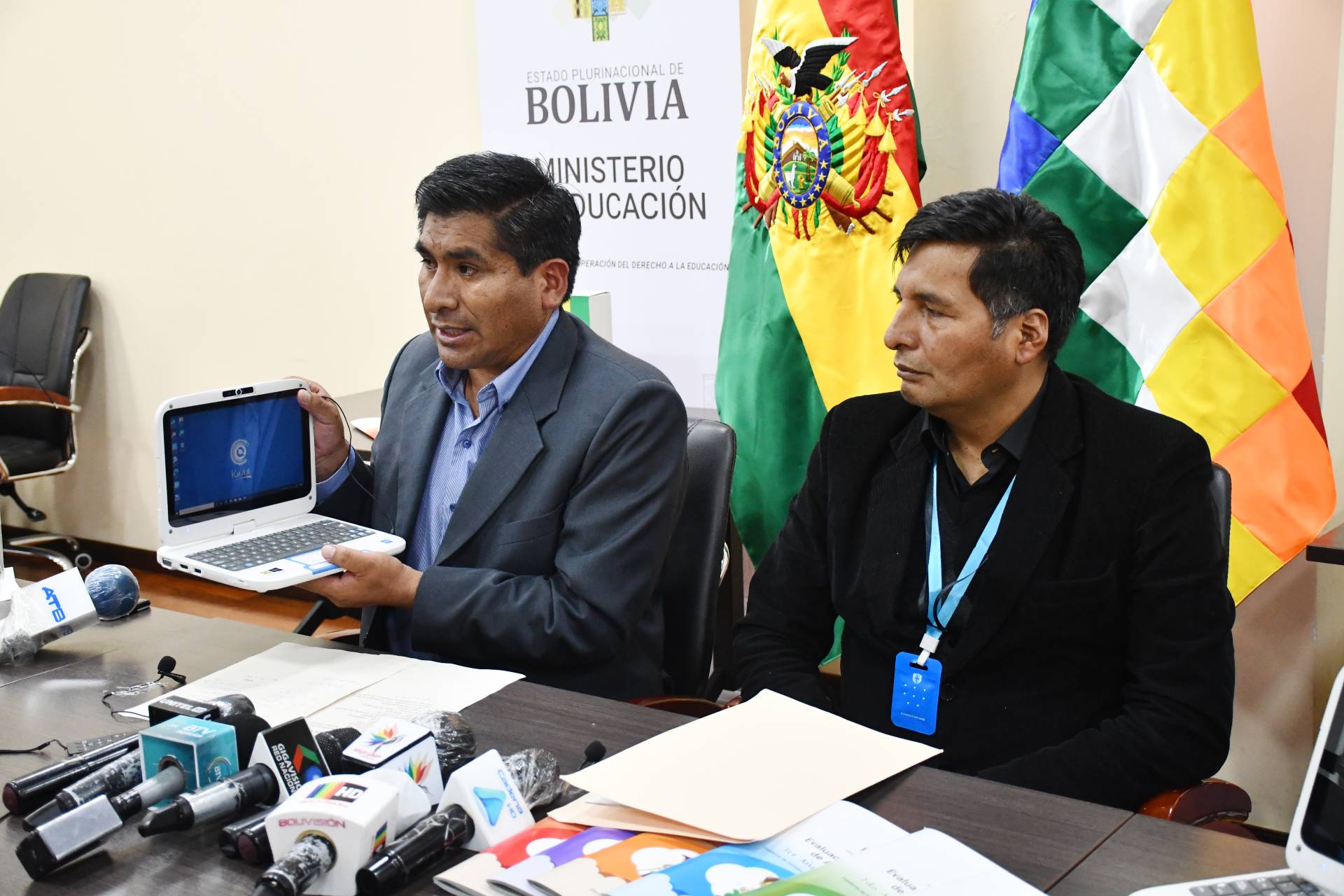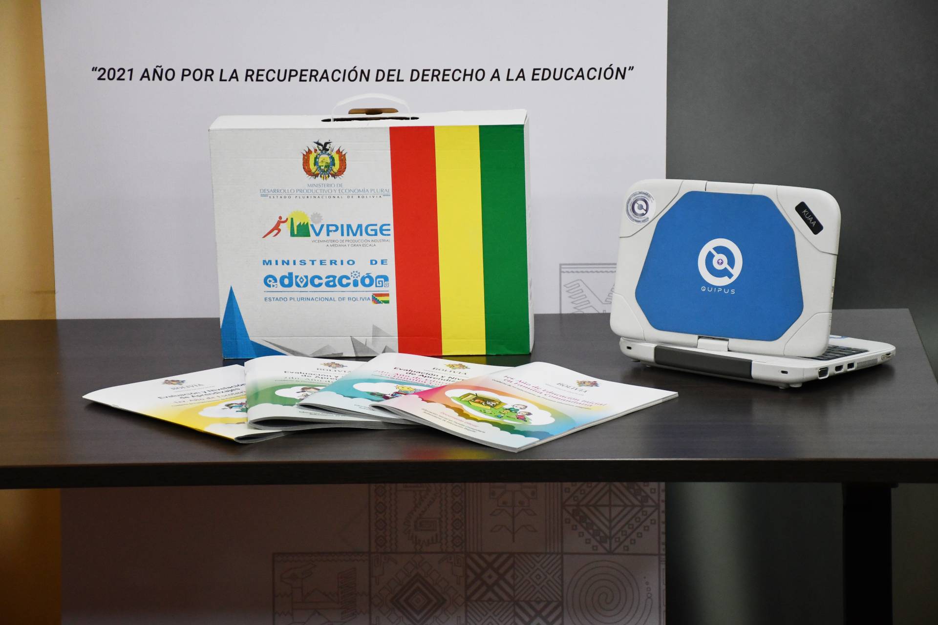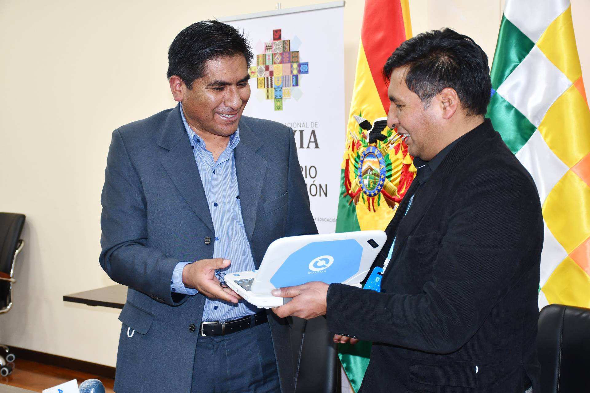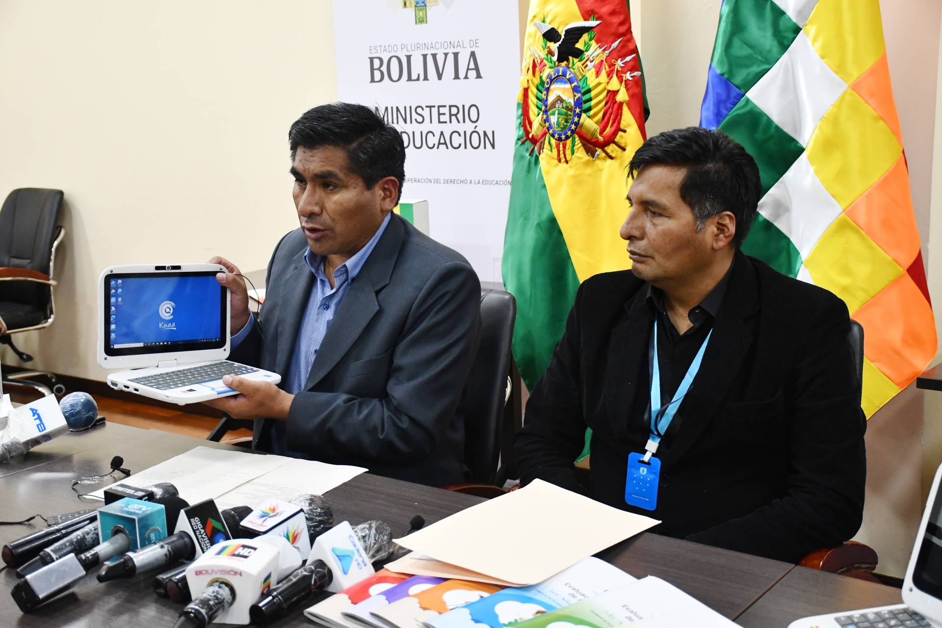 En conferencia de prensa, el ministro Huanca explicó que se trata de una primera entrega inmediata de 9.872 Kuaa y otras dos partidas de 14.297 y 12.755 unidades, haciendo un total de 36.924 equipos de computación de la empresa Quipus, que está entregando el Ministerio de Desarrollo Productivo y Economía Plural a título gratuito al Ministerio de Educación.