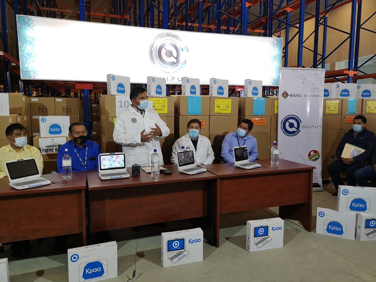 En la oportunidad, el Ministro de Educación Adrián Quelca hizo uso de la palabra, destacando la recuperación del derecho a la educación luego de que el gobierno de facto clausuró el año escolar gestión 2020. “La iniciativa de la recuperación del derecho a la educación es de nuestro presidente Luis Arce Catacora… él nos ha encargado toda una estrategia, de ahí es que hemos implementado distintas modalidades como clases a distancia, clases semi presenciales y presenciales” manifestó la autoridad, resaltando además el apoyo de la Empresa Pública Quipus al mantener actualizados los equipos, lo que representa un beneficio para la educación. Son más de 30 municipios de los departamentos de Santa Cruz, Cochabamba y Chuquisaca los que serán beneficiados con las Kuaa´s, están Santa Cruz de la Sierra, Cotoca, Ascensión de Guarayos, Vallegrande, Portachuelo, Entre Ríos, Shinahota, Punata, Sucre, entre otros.