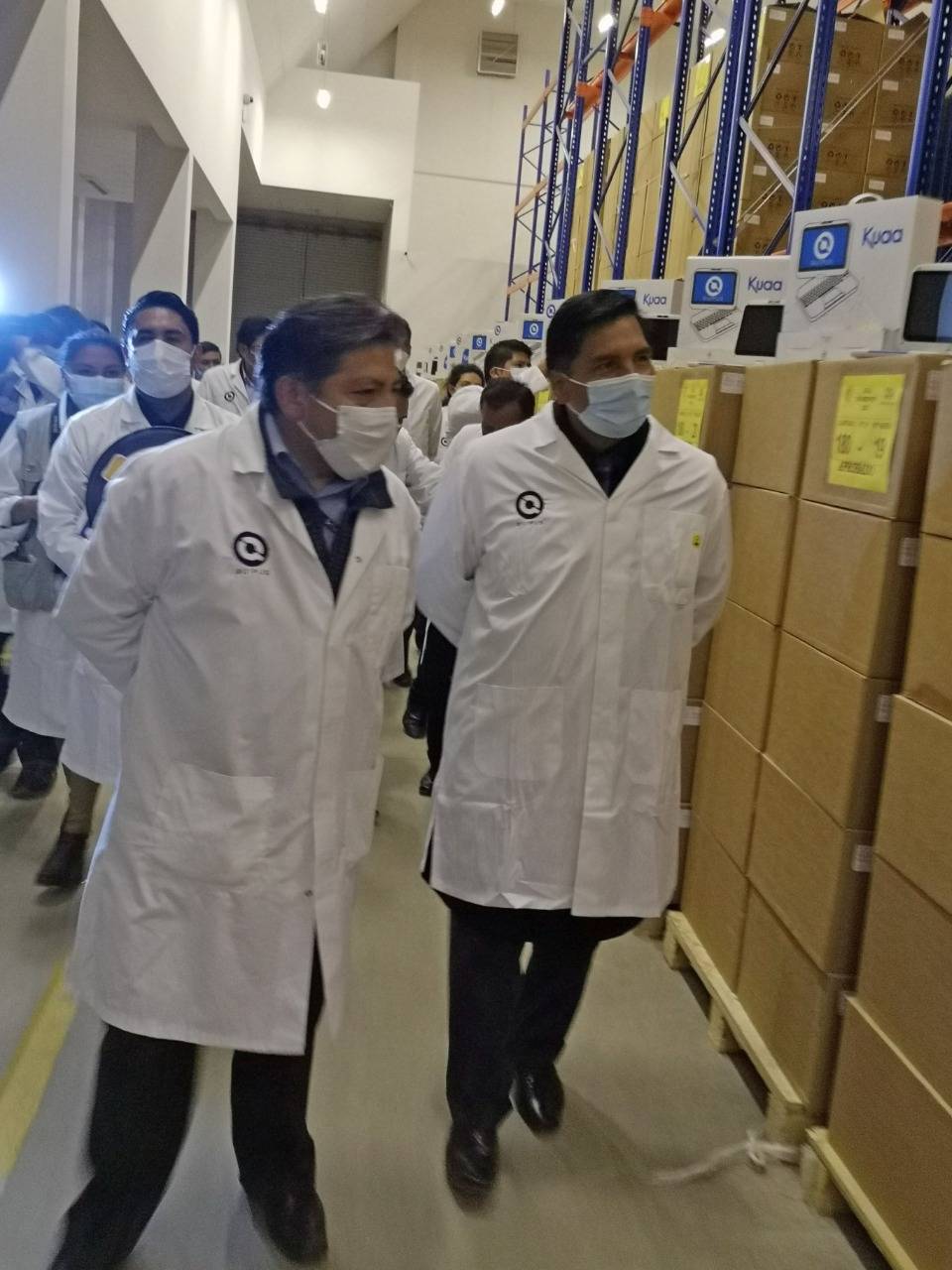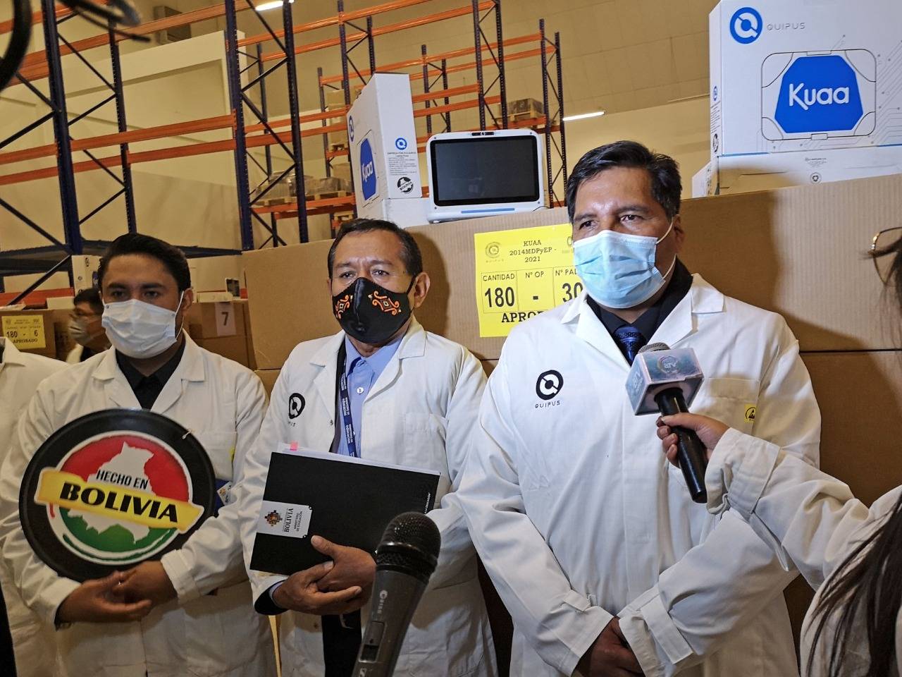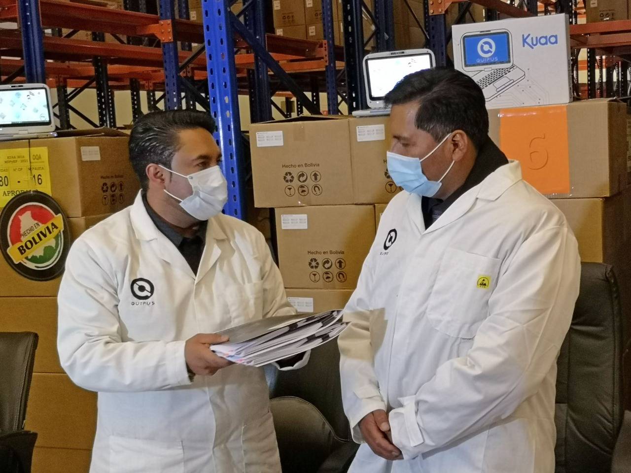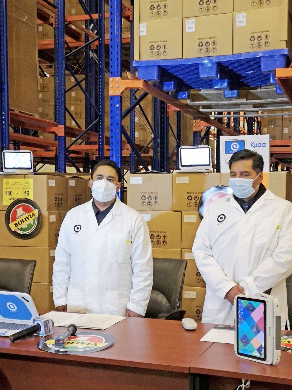 Quipus, La Paz, 11 de mayo.- La noche de ayer, se llevó a cabo en instalaciones de la Empresa Pública Quipus, la entrega de 9.872 equipos tecnológicos Classmate Kuaa por parte del Ministerio de Desarrollo Productivo y Economía Plural al Ministerio de Educación en un acto que contó con la participación del Ministro de Educación, Prof. Adrián Quelca Tarqui, el Viceministro de Educación Regular, Bartolomé Puma, el Viceministro de Producción Industrial a Mediana y Gran Escala, Luis Siles y el Gerente General a.i. de la Empresa Pública Quipus, Alex Machicado.