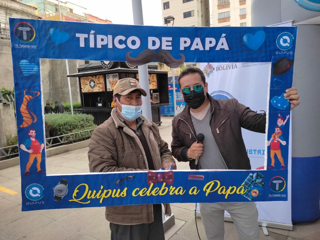 La Paz, 18 mar (Unicom – MDPyEP – Quipus).- La Empresa Pública Quipus, dependiente del Ministerio de Desarrollo Productivo y Economía Plural, desarrolla entre el viernes y sábado actividades para celebrar el Día del Padre con precios especial y concursos en la estación Obelisco de la línea morada de Mi Teleférico. El gerente general de Quipus, Alex Machicado, dijo que esa empresa pública productiva realiza concursos de canto, yo-yo y trompo, estos dos últimos recordando los juegos de antaño, a tiempo de destacar el rol que cumplen los papás en la sociedad y su valioso aporte en el núcleo familiar.»Como empresa pública productiva, rendimos homenaje a los papás del Estado Plurinacional de Bolivia, aplaudimos su esfuerzo, sacrificio y amor brindado a la familia, además de su contribución a la sociedad y la reactivación económica del país», dijo a los periodistas. Machicado invitó a la población visitar, mañana sábado, el stand Quipus habilitado en la línea Morada de Mi Teleférico para que pueda conocer las ofertas que se promociona en equipos tecnológicos y a participar en los concursos. “Los usuarios de este sistema de transporte por cable pudieron probar los equipos de computación disponibles, además de acceder a precios especiales por la ocasión y también llevarse recuerdos por participar de los concursos. También realizaremos la activación el día de mañana sábado 19 de marzo de 10:00 a 14:00 horas, los esperamos”, exhortó.