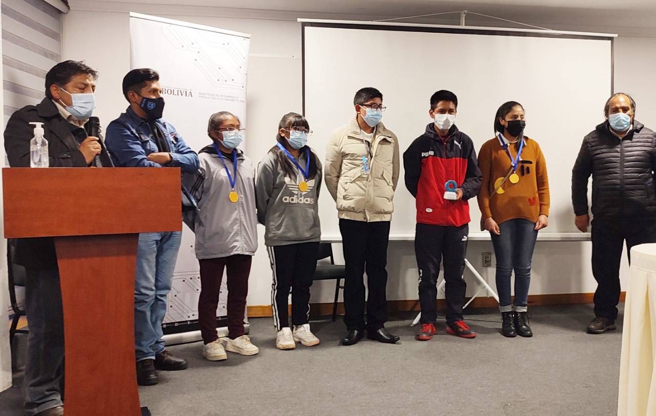 Quipus, La Paz, 21 de diciembre.- La Empresa Pública Quipus, bajo tuición del Ministerio de Desarrollo Productivo y Economía Plural, premió la noche del pasado lunes a los equipos ganadores del desafío de Robots Buscaminas que se realizó el pasado sábado 18 de diciembre en la Planta Ensambladora de Equipos Tecnológicos de Quipus como parte del II Encuentro Nacional de Robótica Humanitaria que este año la estatal organizó como parte de su política de apoyo a la educación e innovación tecnológica.